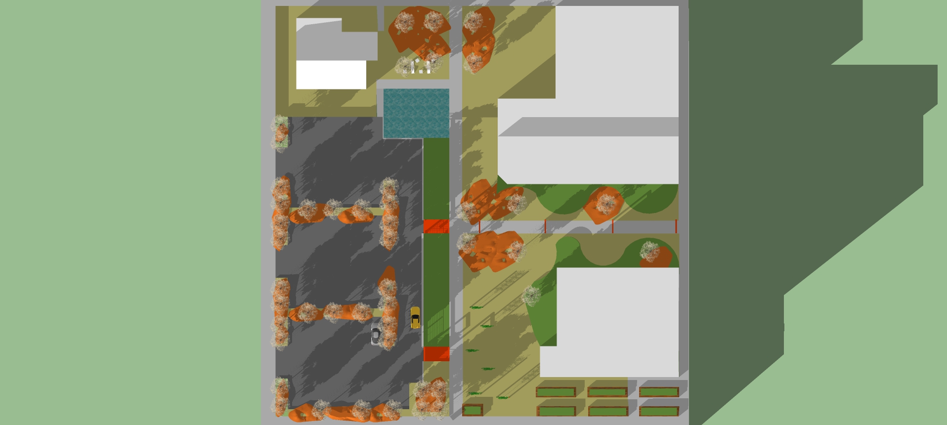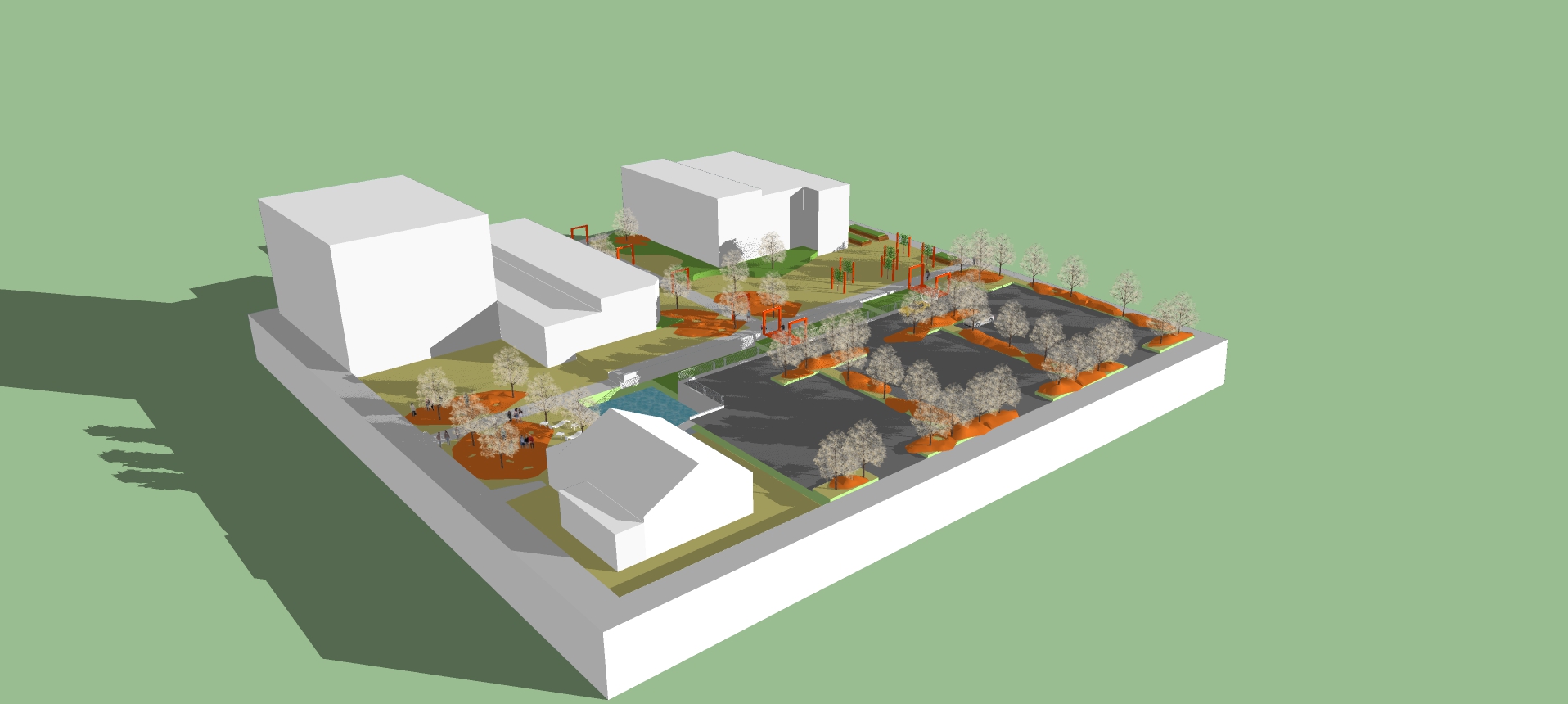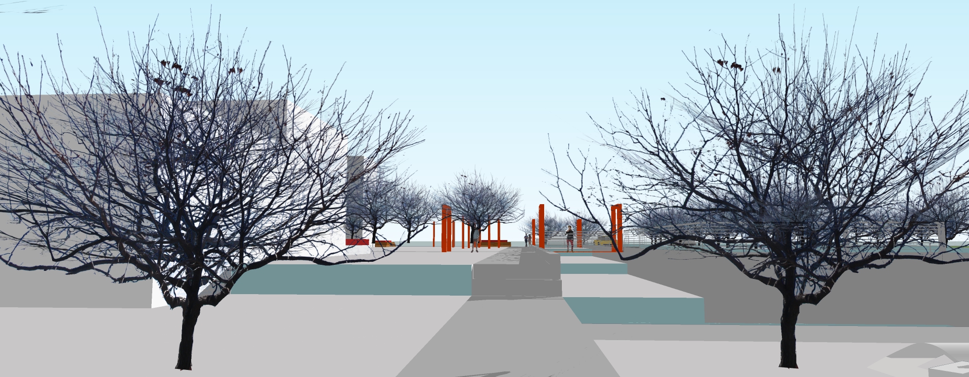 I rendered my site design in SketchUp to demonstrate how the life cycle of deciduous trees will shape the site character. Trees not only provide numerous ecological benefits to the site, they also play a central role in defining space, color palette, and seasonal variety.