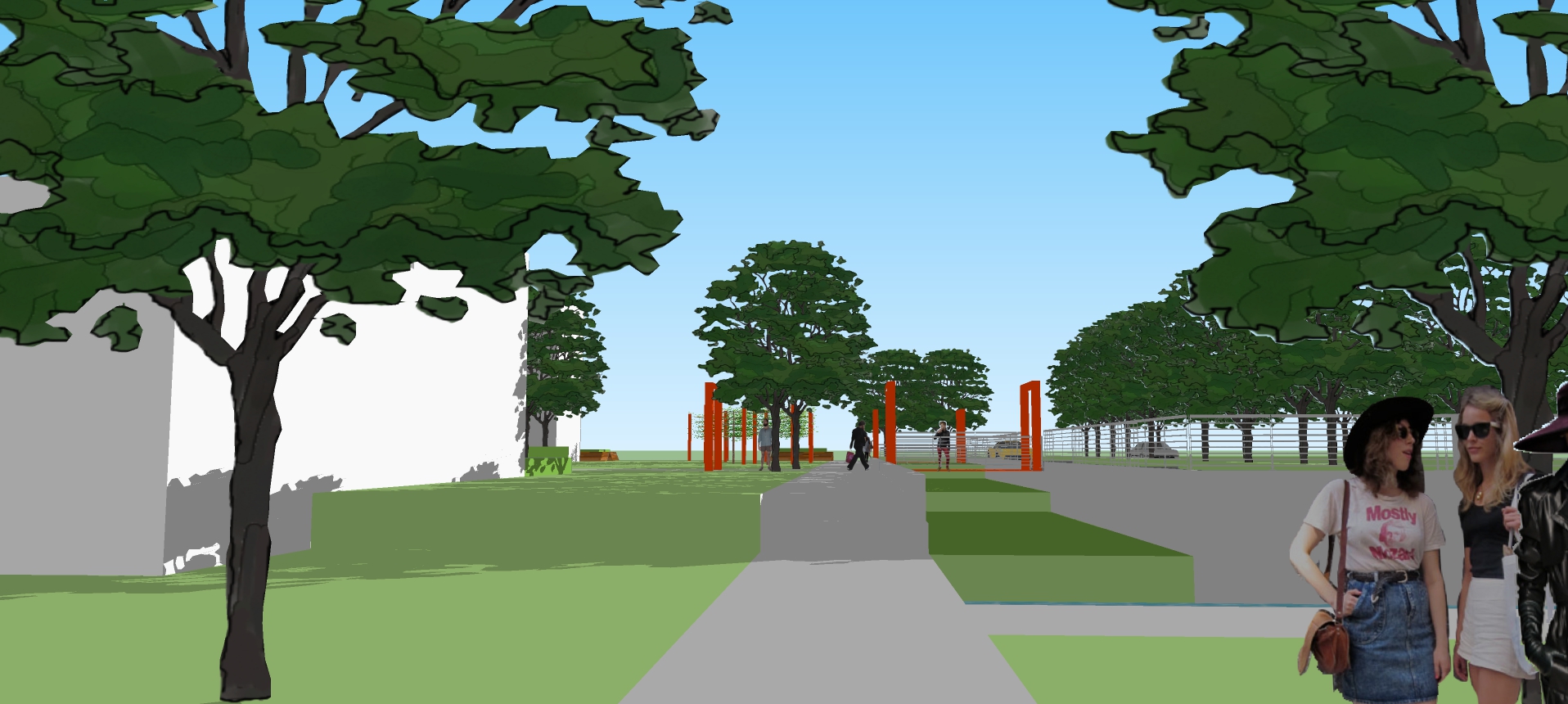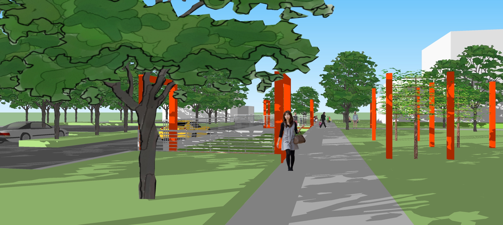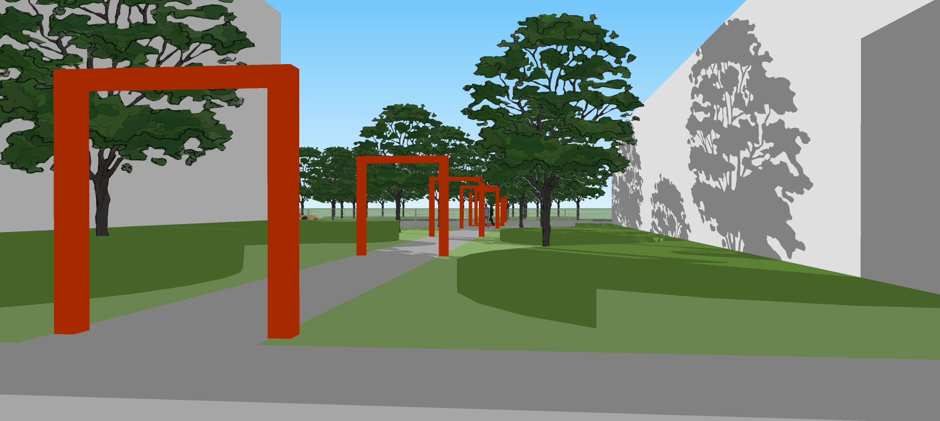 In early Autumn, the trees still hold all the leaves. Their deep green canopies act as a ceiling and cast broad shadows on the ground. The orange arches, pedestrian bridges, and espalier posts in my design contrast with the verdant landscape.