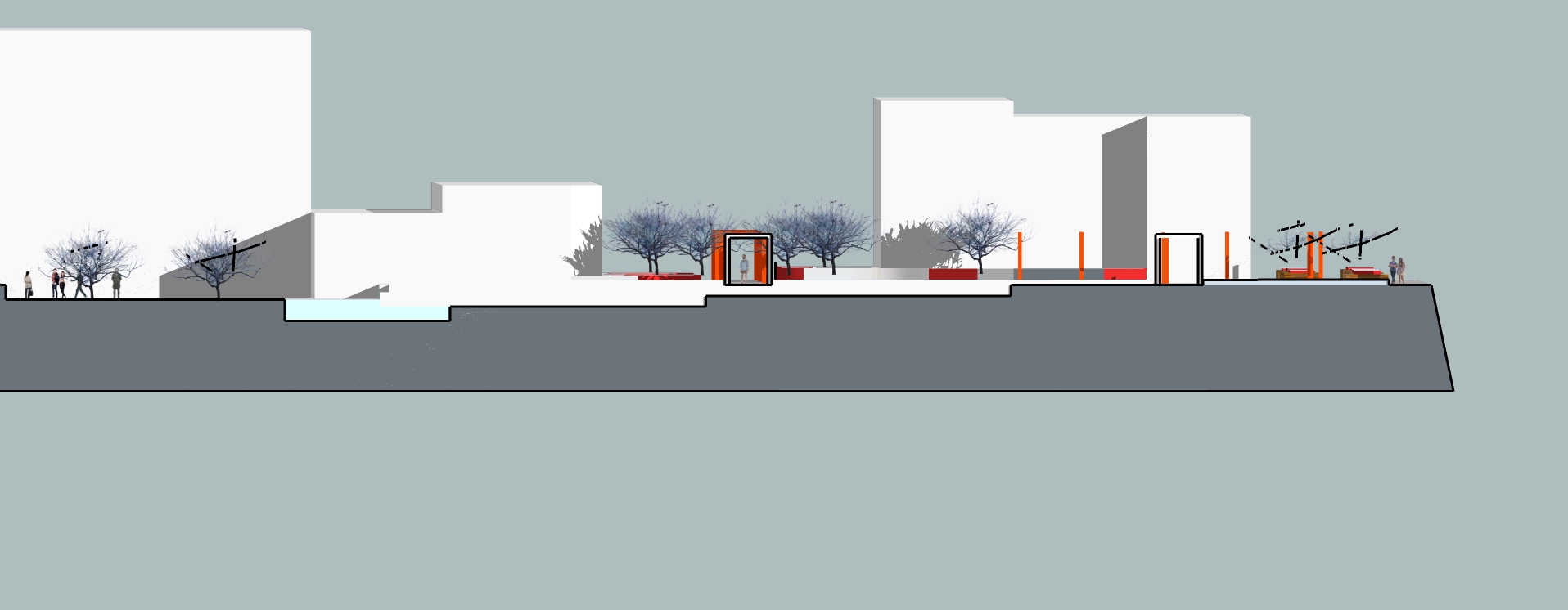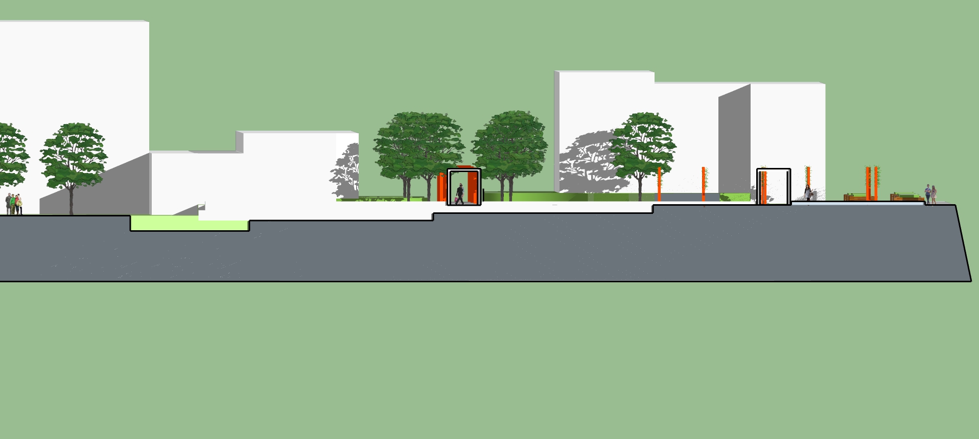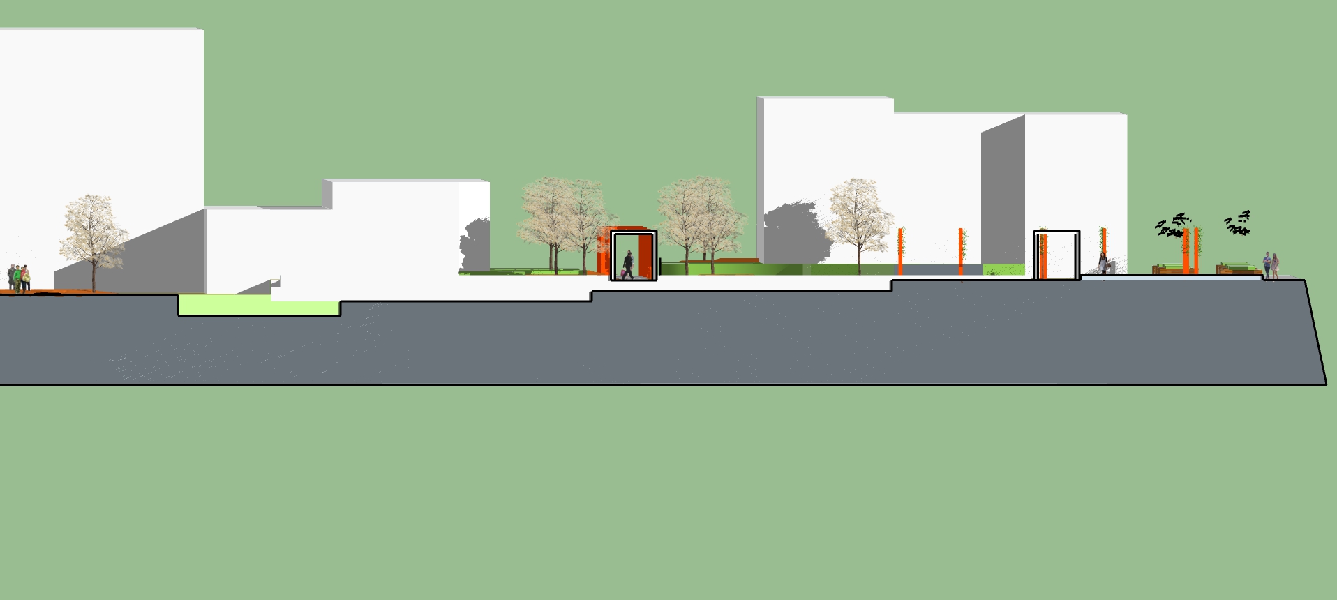 This section cuts through the terraced swale that terminates in a water feature, adjacent to the beer garden. It illustrates how the path parallel to the swale travels in and out of shade.